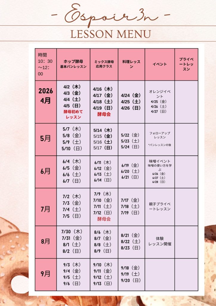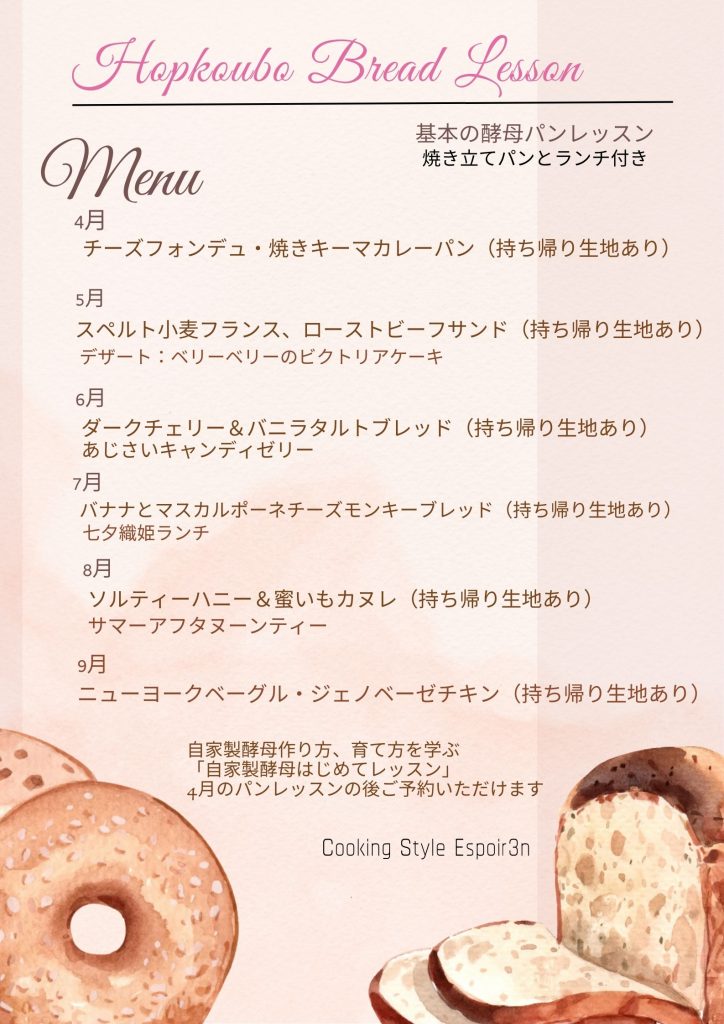 4月ホップ酵母パンレッスンの メニューのお知らせです。